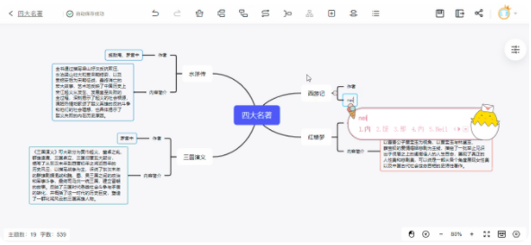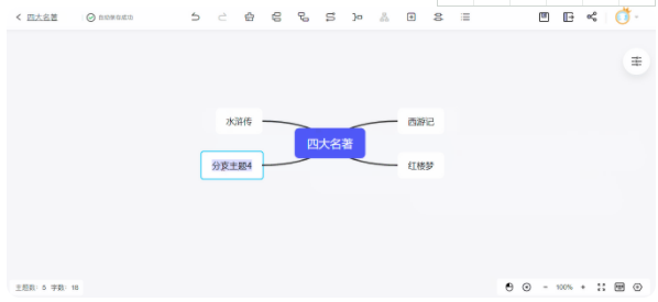 步骤2、进入思维导图编辑界面,双击编辑中心主题,如“四大名著”,再围绕中心主题划分下一级的主题,让整个导图的内容脉络清晰,如四大名著分为红楼梦、西游记、水浒传和三国演义。