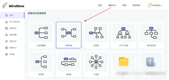 步骤1、在浏览器中打开MindNow思维导图,在“新建空白思维导图”中选择需要的导图结构,如“思维导图”。