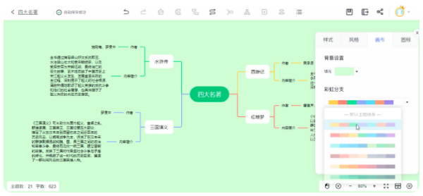 步骤4、思维导图内容编辑完成后,可以根据个人喜好美化思维导图的样式,可以点击右侧的“更多设置”,通过切换主题风格、设置彩虹线条等方式,让思维导图更加美观。
