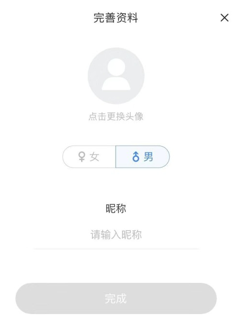 4、完善资料才能使用美图秀秀软件,只要上传头像,确定性别,输入一个昵称即可。