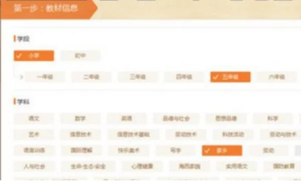 4、接着是选择教材信息,以此选择具体的学段、年级段、学科以及版本,如下图所示。