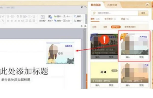 6、成功选择完合适的课件后,在课件功能栏将会出现之前选择的课件,拖动想要下载的课件到左边的演示文稿中,即可开始下载此课件,如下图所示。