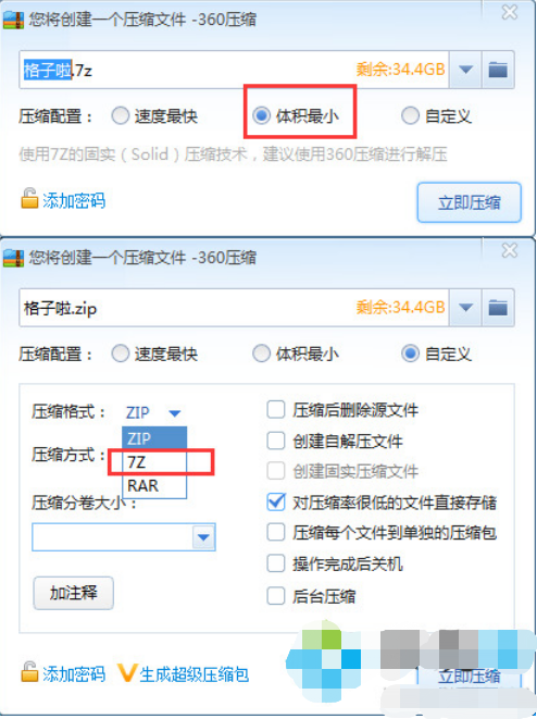 2、在弹出的对话框可以任意选择,这里随意举例,选“体积最小”,压缩格式为“7Z”,选择完后点击立即压缩,等待压缩完成即可。