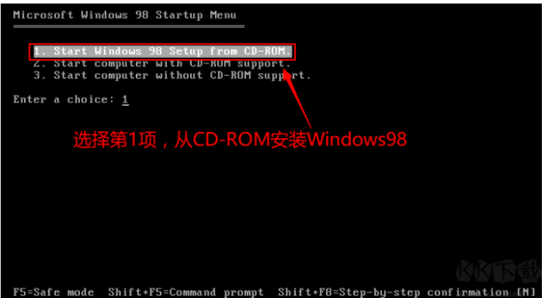 1、准备好Microsoft Windows 98 安装光盘,接下来会出现以下界面,我们选择第一项进入。