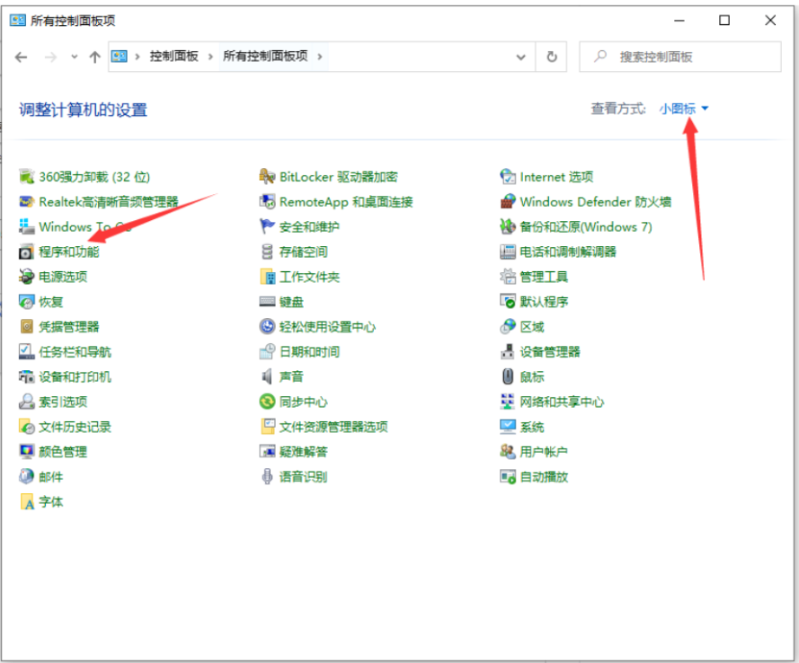 2、将查看方式切换成小图标,然后找到并点击程序与功能。