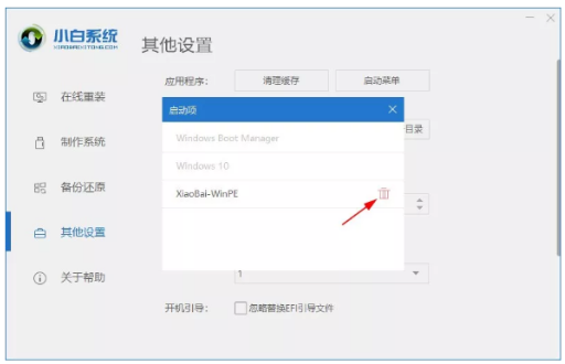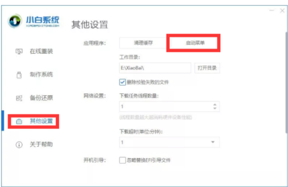 1.打开小白一键重装系统,找到【其他设置】,选择【启动菜单】。