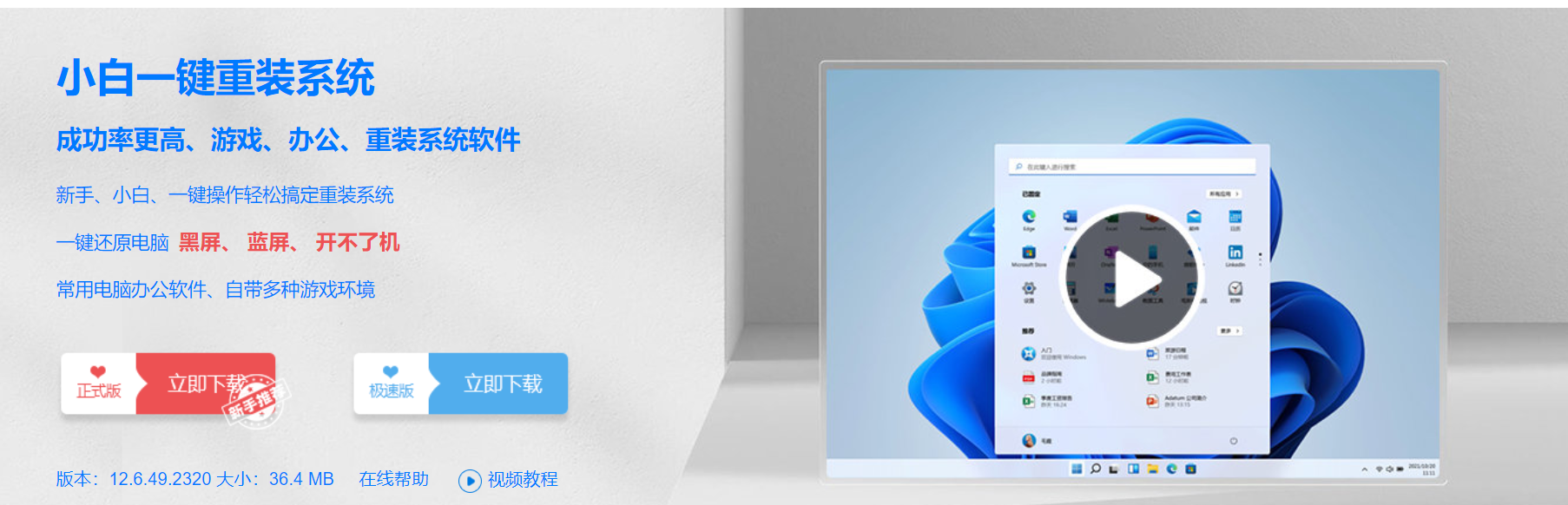 小白一键重装系统是目前一键在线重装系统行业的领航者,十年安装系统技术推出的小白重装系统工具已让3千万台电脑重装系统成功。