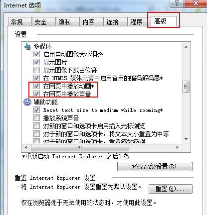 如果不是病毒文件造成的话,查看是不是ie浏览器是不是将你的视频设置禁止了。解决方法就是先点击ie浏览器,然后在菜单栏上“工具-internet选项”切换到“高级”选项,在设置多媒体项上将“在网页中播放动画”前面的勾勾起来即可。如图所示: