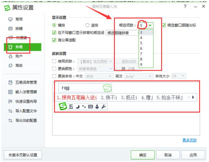 2、在属性设置面板中我们选择“外观”选项,然后在右侧就能看到显示设置中有一个“候选设置”,这里设置的搜狗五笔输入法默认的是5个候选词,五笔的重码率本身很低,且搜狗五笔对候选项的排序进行了特殊的优化。推荐选用默认的5个候选词。如果候选词太多会造成查找时的困难,导致输入效率下降(如下图所示)。如果需要更改更多的候选项可点击下三角按钮在下拉框中选择就可以了。