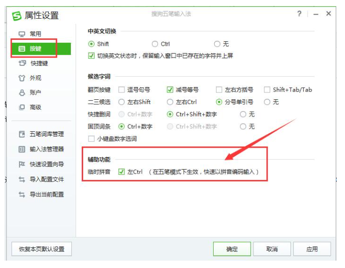 3、在搜狗五笔输入法设置面板中,选择第二项按键设置。打开后我们可以看到这个面板中的下方有一个辅助功能,我们勾选“临时切换拼音”的设置,其中的快捷键设置的是左Ctrl,当我们在使用输入法时按下左Ctrl后就可以切换到临时拼音了。