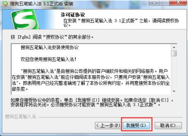 3、点击下一步后,我们就来到这个“许可证协议”界面,在这里我们先仔细阅读搜狗五笔输入法的使用协议,阅读完成后点击“我接受”继续安装。
