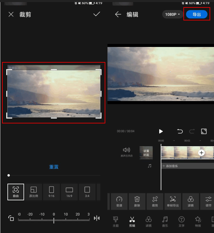 2、调整剪切的选区,将需要去除的水印裁剪出去,完成后选择“导出”即可。