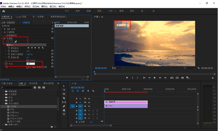 2、在效果控件中,选择工具框选水印区域。随后设置半径,将水印区域变模糊直至消失。