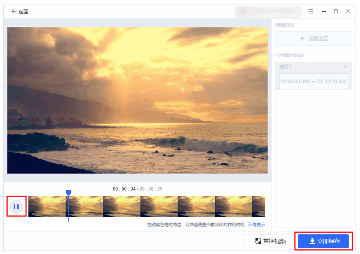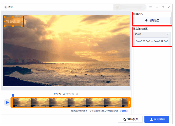 3、点击“创建选区”,用选区将水印覆盖,随后设置去除水印的时间点。