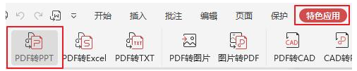 1、打开我们需要转换的PDF文档,点击“特色应用”-“PDF转PPT”。