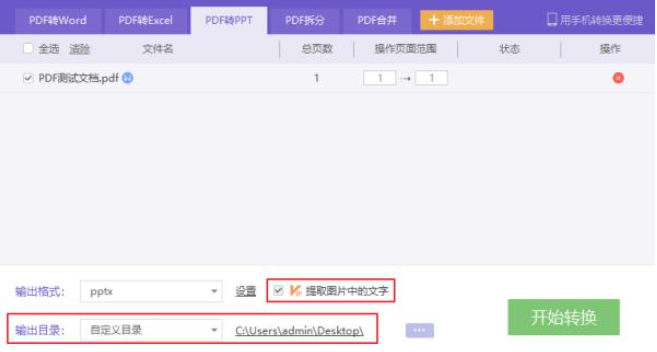 2、在弹出的界面中选择输出目录,保存到我们想要的位置,这里建议在转换前勾选“提取图片中的文字”最后点击开始转换即可。