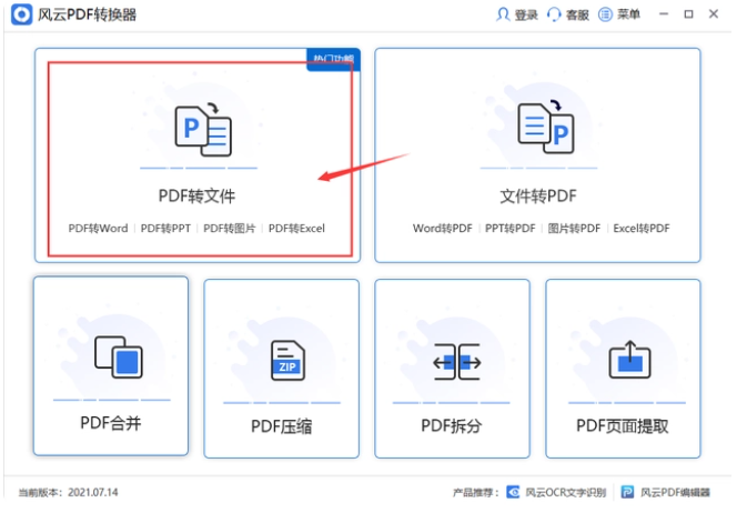 1、这是一款比较好用的第三方转换工具,我们自行在电脑查找“风云PDF转换器”安装好打开,进入首页后,点击第一个“PDF转文件”。