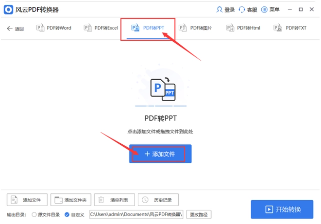 2、然后在最上面找到“PDF转PPT”功能,点击“添加文件”支持批量的文件添加。