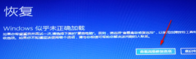 1、首先我们按下开机键,等待出现微软logo,强制关机三次,点击“查看高级修复选项”进入高级启动界面。