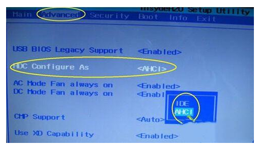 2、进入 bios后,通过键盘方向键选中“Advanced”,再选中“HDC Configure As”,按回车键。