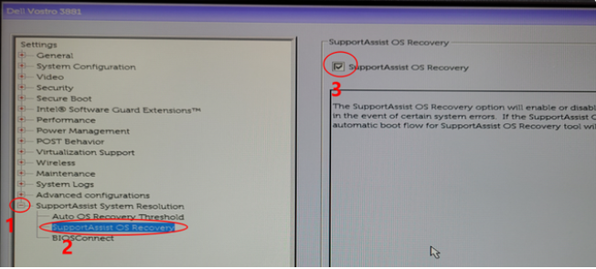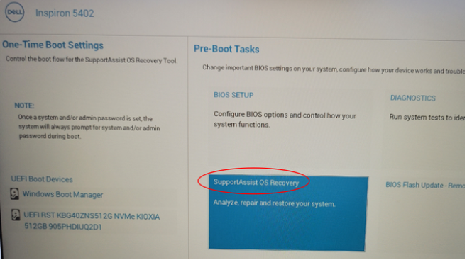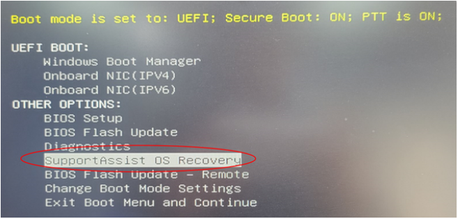 1、重启电脑,期间不停地敲击“F12”键,直至出现下图的画面。并选择红框里的“SupportAssist OS Recovery”进入。