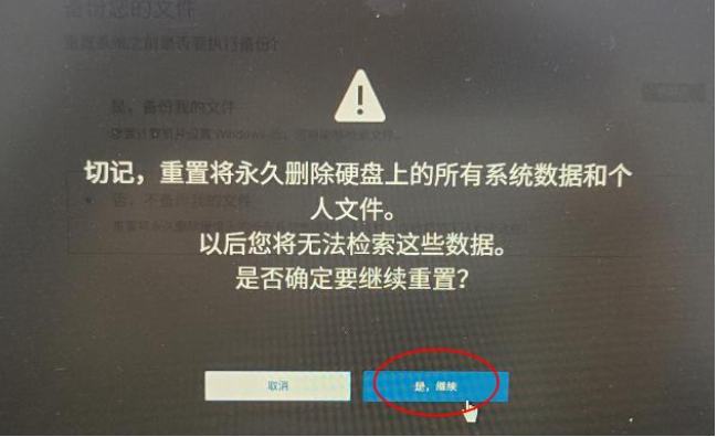 6、自行决定是否备份文件资料,然后点“是,继续”重置操作。