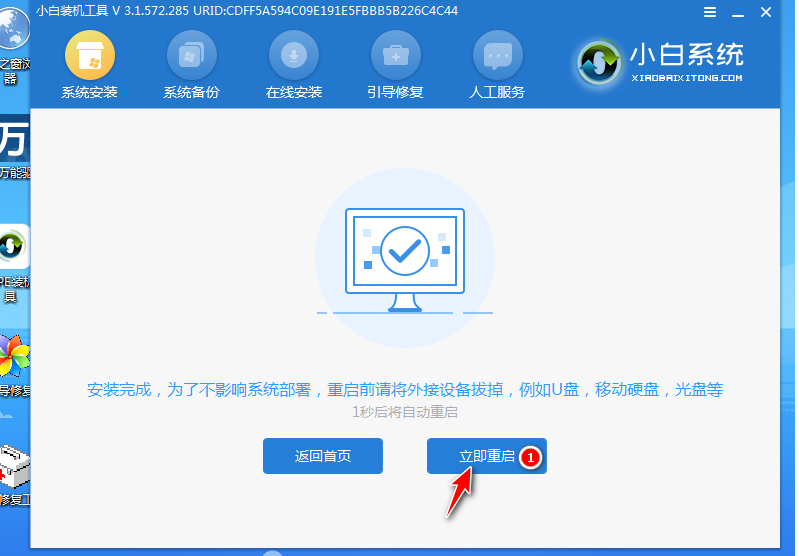 当提示安装完成后,需要先拔掉u盘,然后再重启电脑。