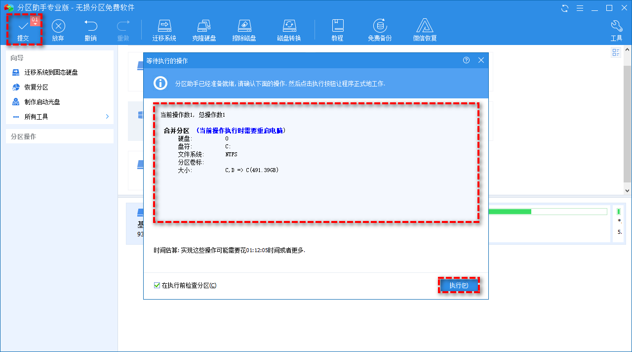 步骤3. 返回主界面,单击左上角提交按钮以预览即将进行的任务,确认无误后单击执行以开始将两个相邻的分区无损合并在一起。