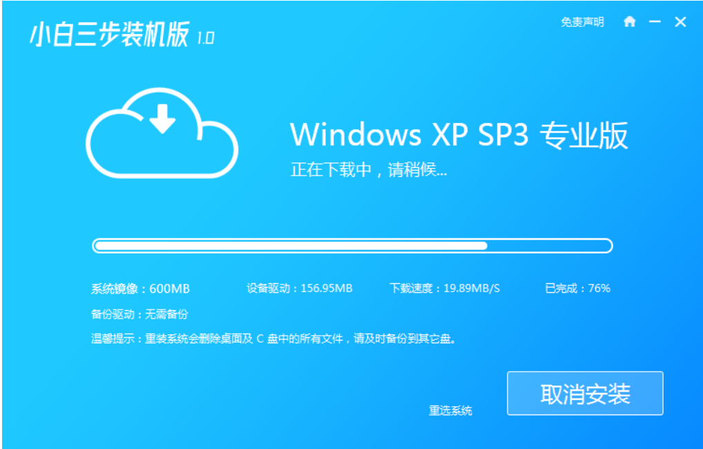 2.软件将自动帮助我们下载WindowsXP镜像和PE。请耐心等待。