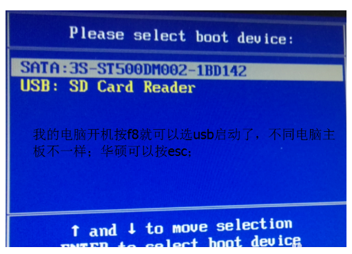 2.在开机时,按启动热键进入后选择usb的选项。