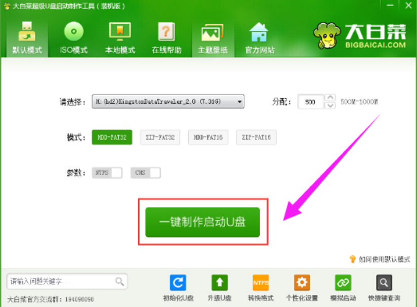 1、下载并且安装大白菜装机版,打开软件,插入u盘,点击“一键制作启动u盘”。