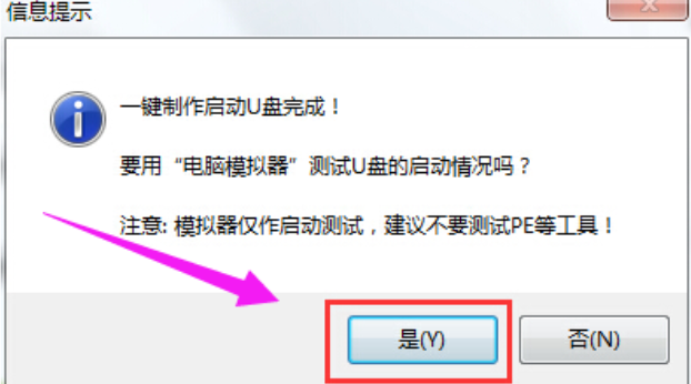 4、完成写入之后,在弹出的信息提示窗口中,点击“是(Y)”进入模拟电脑。