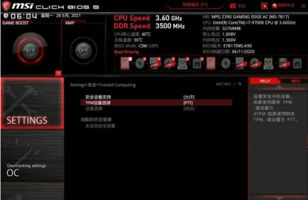 1、重启按DEL进入BIOS,按F7进入高级模式,点击进入Settings的【安全】选项,再进入Trusted Computing。