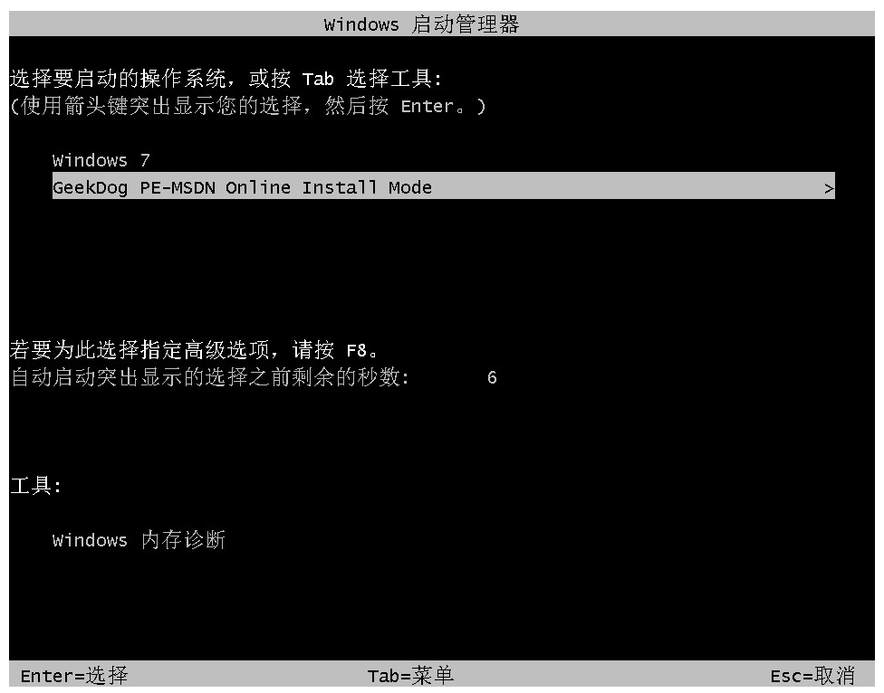 5、下载完成后重启电脑,进入启动页面时,选择“GeekDog..”项,回车进入pe系统。