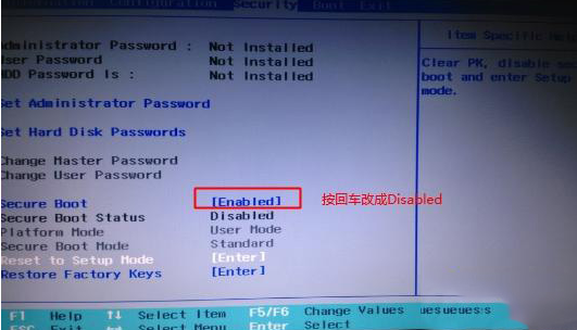 1、重新开机一直按F2或(FN+F2)进入BIOS,按→方向键切换到Security,选择Secure Boot回车设置成Disabled。