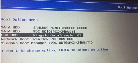6、然后再按照方法一制作好U盘启动盘,插入电脑重启按F12或FN+F12调出启动管理对话框,选择USB HDD识别到U盘启动进入PE系统内,按照方法一的操作安装win7系统即可。