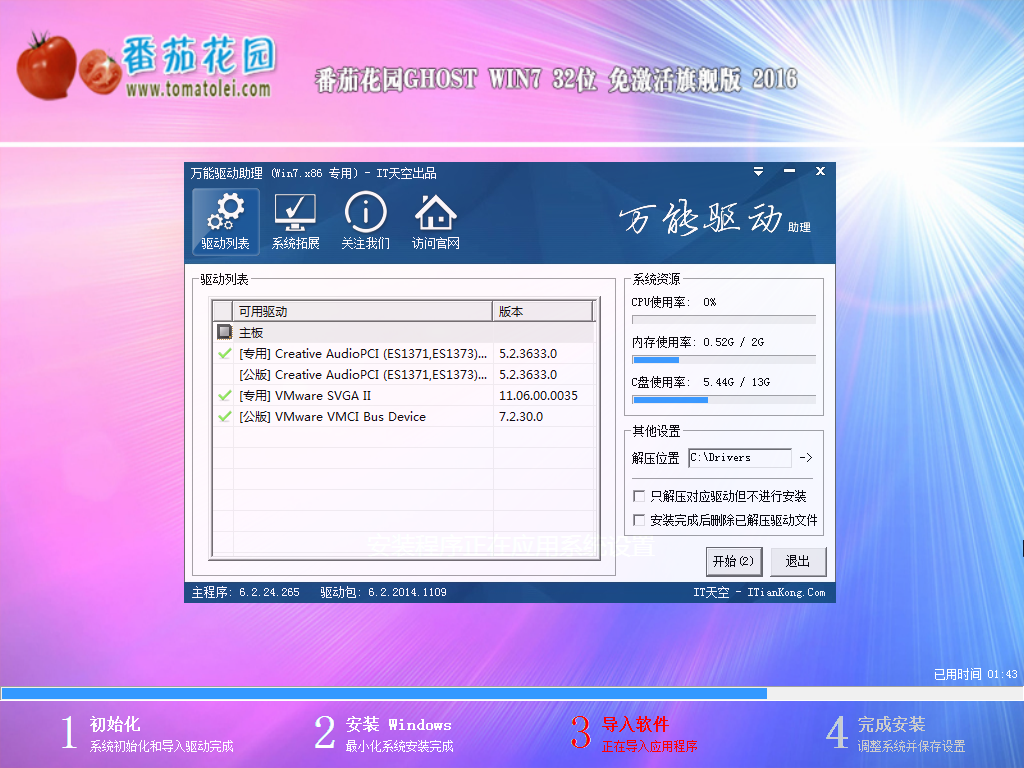 - 集成常见硬件驱动,智能识别+预解压技术,绝大多数硬件可以快速自动安装相应的驱动。