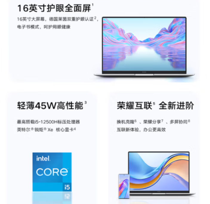 这款拥有全新的外观设计,产品性能优化到位,屏幕性能优秀,通过护眼认证,机身即便全速运行噪音极小,续航同级别领先,以及非常好用的荣耀多屏协同,此外增加了机器克隆模式和无线高速传输(70M/S)同级别速度最佳。同时全面采用了微型化PD充电器,出门也可以直接给手机充电,整台设备的实用性拉满,目前价格也很有竞争力,12代酷睿加16G+512G配置。(PS:多屏协同支持荣耀、华为手机)