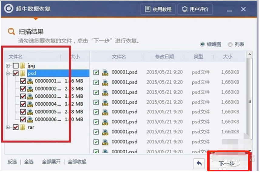 3、你可以选择扫描指定的文件格式。扫描之后会将能够恢复的文件罗列出来。点击“下一步”。