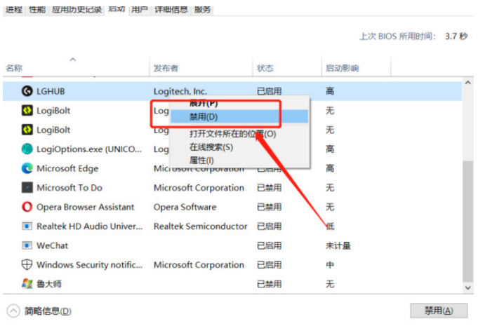 2、在任务管理器页面我们将不必要的应用设置为“禁用”。