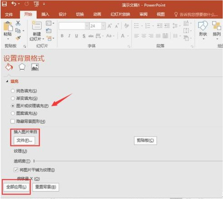 2、接着在“填充”中选择“图片或纹理填充”,然后选择插入图片来源为“文件”,最后点击全部应用就可以了。