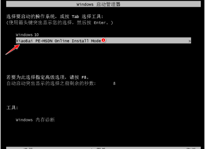 4、电脑重启之后将会进入了开机选项页面,选择第二项xiaobai-pe系统按回车键进入。