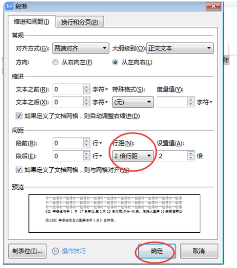 2、来到段落设置界面,点击缩进和间距,找到间距,根据需要对行距进行设置,这里选择2倍行距并确定。