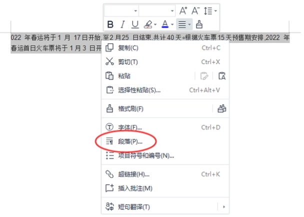 1、打开word文档,选中需要调整的文字段落,接着鼠标右击,在右键菜单中点击段落进入。