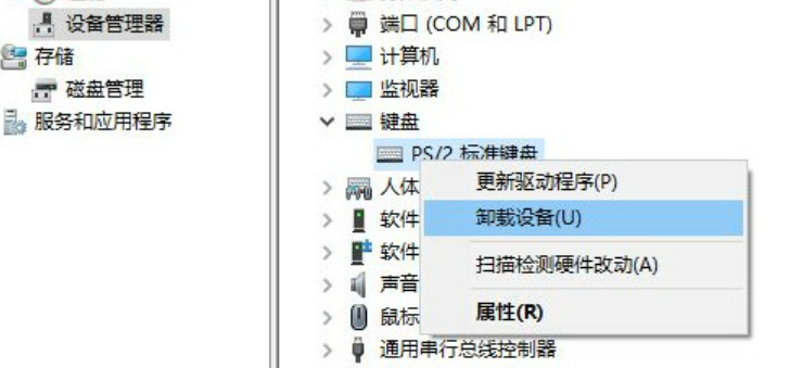 3、正在使用的笔记本键盘,选择卸载设备。然后重新 开机使用电脑,即可。