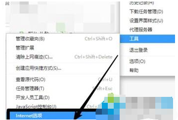 1、打开360浏览器,点击右上角【三横】——>【工具】;工具菜单,选择【Internet选项】。