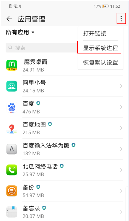 1、打开设置,搜索进入应用管理,点击更多(?) > 显示系统进程。
