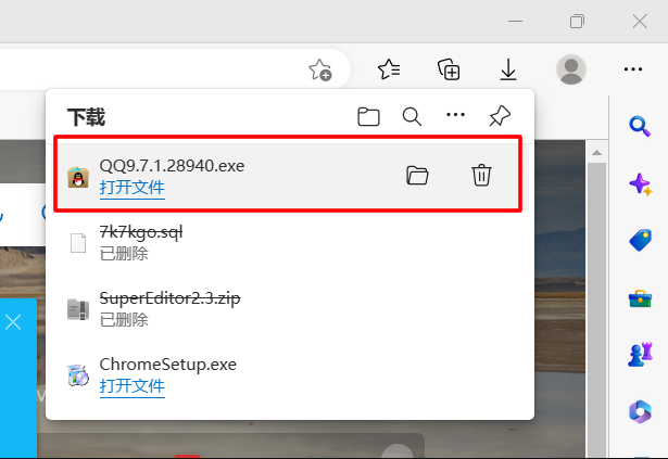 4、下载QQ完成后,按住CTRL键+J键,就会显示下载的QQ程序安装文件,这里我们点击打开文件,选择自定义安装,避免腾讯给我们送全家桶程序套餐。