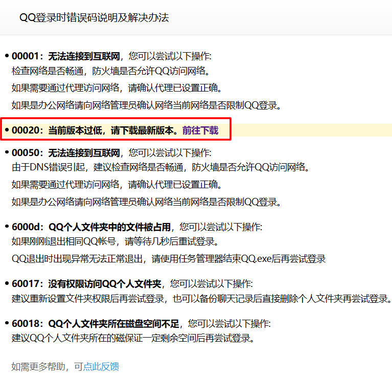 2、看红色框标注部分,错误代码00020,当前版本过低,请下载最新版本,点击“前往下载”链接文字部分。